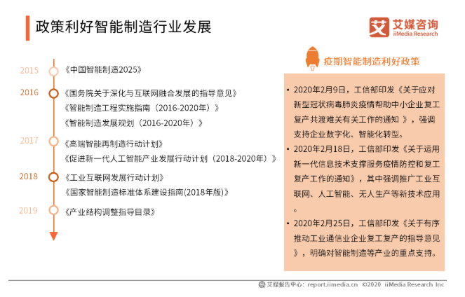隨著人口紅利消失制造業(yè)成本上升,國(guó)家近年發(fā)布多項(xiàng)政策支持制造業(yè)智能化轉(zhuǎn)型。疫情期間,國(guó)家也接連印發(fā)相關(guān)文件明確了對(duì)智能制造等重點(diǎn)產(chǎn)業(yè)的支持。艾媒咨詢分析師認(rèn)為,智能制造在疫情期間曝光度增加,其表現(xiàn)也受到各界認(rèn)可,相關(guān)鼓勵(lì)發(fā)展政策出臺(tái)也為行業(yè)進(jìn)一步發(fā)展提供契機(jī)。