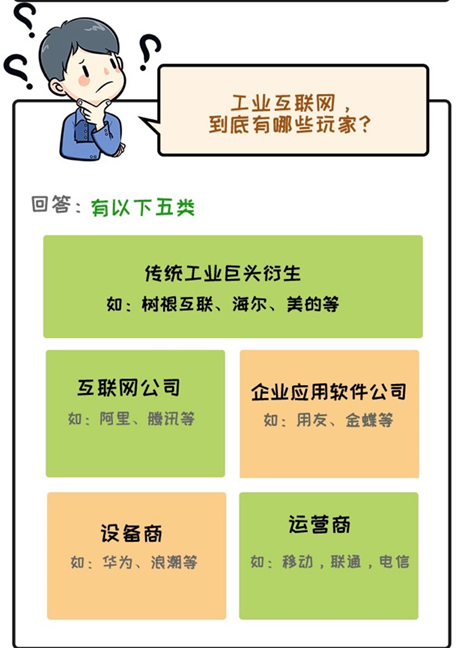 在工業互聯網中,有五類玩家。而樹根科技扮演的正是傳統工業巨頭衍生的角色。