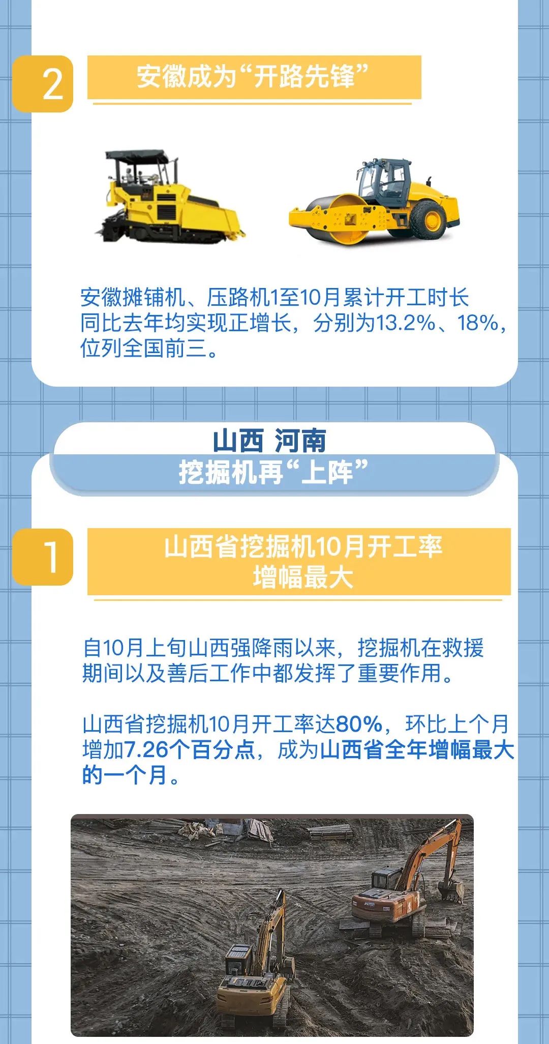 安徽則成為了“開路先鋒”。作為路面設備,其攤鋪機、壓路機1至10月累計開工時長同比去年均實現正增長,分別為13.2%、18%,位列全國前三。