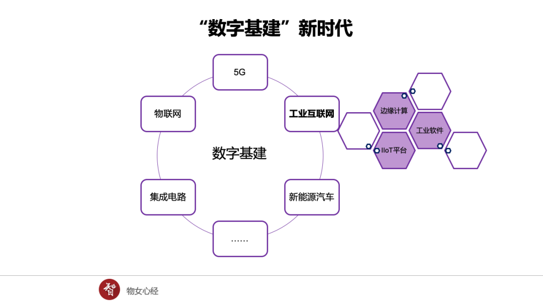 更進一步,這次席卷而來的全新“基建時代”,與“鐵公基”和房地產為代表的“傳統基建”時代有著本質不同,被賦予了新的科技內涵。當前的投資聚焦于高質量發展的領域,以5G、物聯網、工業互聯網、新能源為代表的“新型基礎設施”成為發展重點。