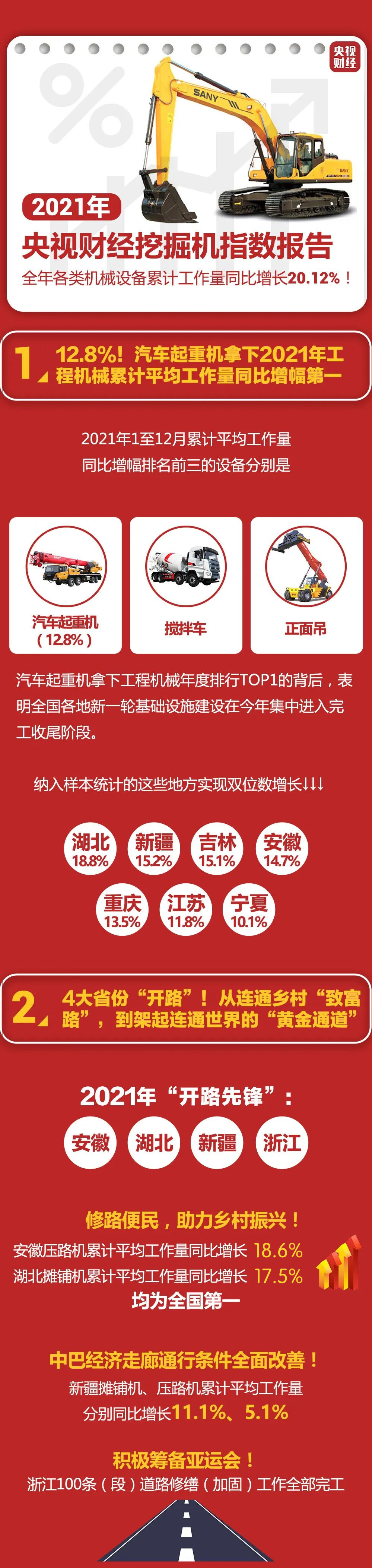 2021年我國持續加大基礎設施建設力度,為社會經濟發展注入強勁動力。央視財經挖掘機指數顯示,2021年我國各類工程機械設備累計工作量同比增長20.12%!