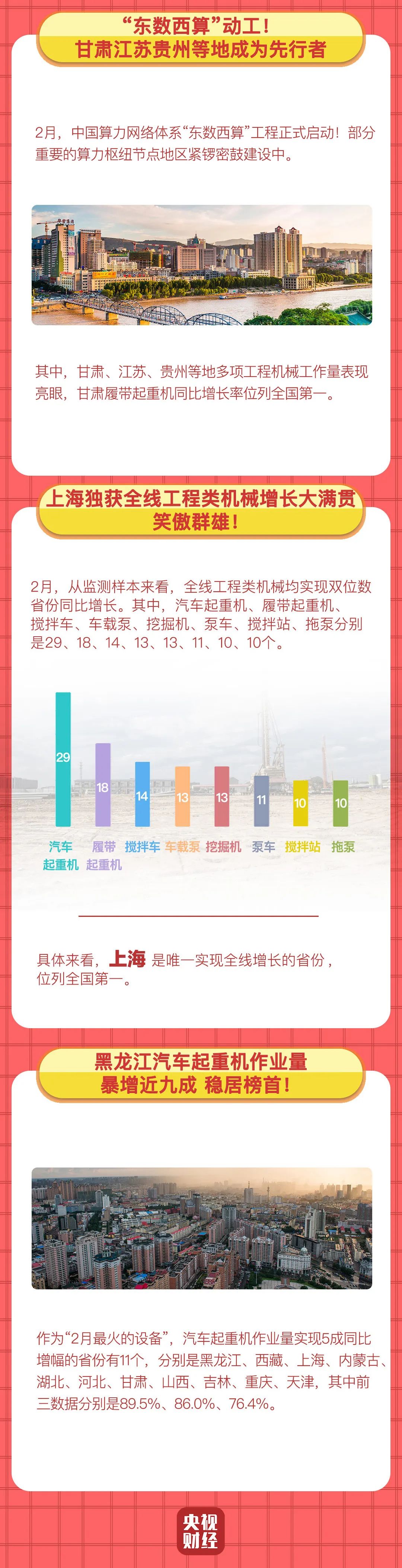 央視財經(jīng)與三一重工、樹根科技聯(lián)合打造的“央視財經(jīng)挖掘機指數(shù)”今天發(fā)布了最新相關(guān)數(shù)據(jù)。2月份,雖然受虎年春節(jié)假期影響,但是我國各類工程機械作業(yè)量穩(wěn)步增長,多省份工程建設(shè)更是跑出了“虎年加速度”。