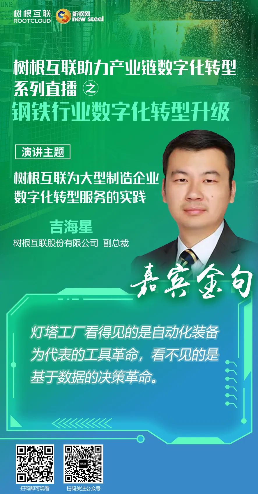2022年5月7日,在廣州市“鏈長制”辦公室(廣州市工業和信息化局)的指導下,樹根科技作為廣州市“軟件和信創”產業鏈“鏈主”企業,聯合新鋼網舉辦樹根科技助力產業鏈數字化轉型系列直播之“鋼鐵行業數字化轉型升級”活動。 本次直播累計在線觀看達到2300+人次,獲得了鋼鐵行業從業者們的高度關注,活動邀請了張杰斐、吉海星、劉連珍三位行業專家分享了對鋼鐵行業數字化轉型升級的實踐與思考,為廣大鋼鐵企業提供了轉型升級的新思路。