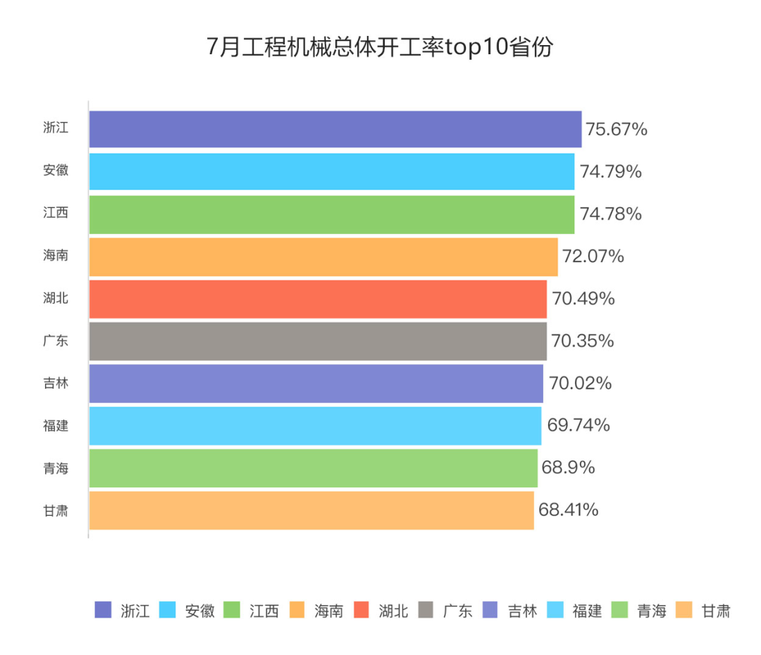 7月,以廣西、廣東、海南、福建為代表的東南沿海地區涌動著高質量發展的強勁脈搏,工程機械總體開工率均實現環比正增長,增幅分別達到3.11%、1.97%、1.18%、1.17%。
