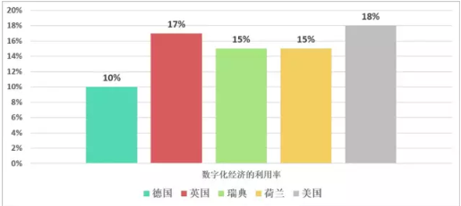 截至2017年上半年的統(tǒng)計(jì)結(jié)果,德國(guó)數(shù)字化產(chǎn)業(yè)對(duì)GDP貢獻(xiàn)僅為5.4個(gè)百分點(diǎn),根據(jù)麥肯錫研究機(jī)構(gòu)數(shù)據(jù),德國(guó)對(duì)于數(shù)字化經(jīng)濟(jì)的利用僅僅在總量的10%左右,低迷的數(shù)字化經(jīng)濟(jì)增長(zhǎng)會(huì)讓德國(guó)至2025年的八年中失去5000億歐元的產(chǎn)值。