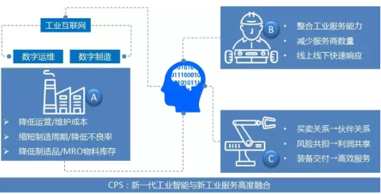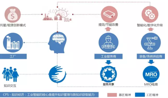 CPS工業智能,立足于用戶需求:一方面通過以數字運維,驅動工業服務、MRO電商、工業維修知識交互生態,以促進工匠文化,深化用戶內部和外部知識積累、沉淀和優化,使得供需雙方獲得新的增長能力;另一方面,則是以領先制造業的智能化/數字化制造為驅動,或在可托管和租賃領域(工程機械、農業機械、能源和物流)實施物聯網應用,促進器匠文化,驅動裝備制造業、工業服務業發展服務型制造/創新型服務。