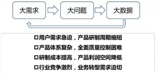 制造型企業(yè)面臨著客戶需求個(gè)性化,產(chǎn)品上市時(shí)間短,研制成本提高等巨大挑戰(zhàn)。這種挑戰(zhàn)本身更多體現(xiàn)在企業(yè)與企業(yè)之間如何以更低的成本、更高的質(zhì)量、更快的速度滿足客戶多樣的需求。所以傳統(tǒng)方式很難解決大數(shù)據(jù)時(shí)代的企業(yè)問題,需要有創(chuàng)新的手段來解決。目前越來越多的企業(yè)通過大數(shù)據(jù)來驅(qū)動(dòng)業(yè)務(wù)創(chuàng)新,提升產(chǎn)品質(zhì)量、降低研制成本、加快上市周期。