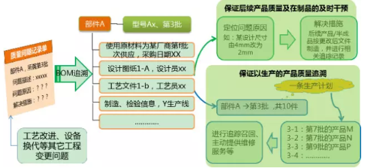 目標(biāo):可通過BOM集成管理的數(shù)據(jù),進(jìn)行產(chǎn)品問題的向上及向下追溯,一方面追蹤問題根源并對其影響范圍進(jìn)行確定(如存在多少在制品等)并干預(yù),保證后續(xù)產(chǎn)品的質(zhì)量;另一方面根據(jù)問題根源,改進(jìn)原材料或設(shè)計(jì)工藝等,從根源上解決問題,降低問題重復(fù)帶來的損失。