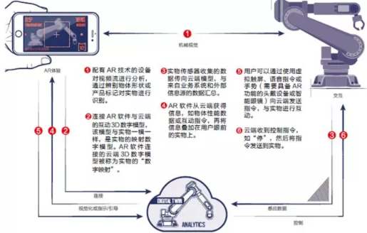 《哈佛商業(yè)評論》中文最新一期刊登了管理大師邁克爾波特和PTC的CEO Heppelmann聯(lián)合發(fā)布的文章《管理者的AR指南》。普通用戶可以下載這篇文章,只需要借助簡單的手機APP,就可以看到紙面上跳出來真實運轉(zhuǎn)的機器人,和機器人的數(shù)字孿生模型在不斷地跳閃著工作狀態(tài)。